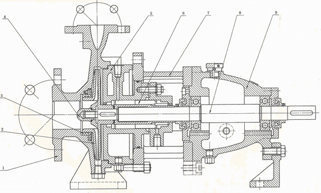 离心泵是由许多零件组成的,根据工作时各部件所处的工作状态,大致可以分成三大类型:转动部件、固定部件和交接部件。