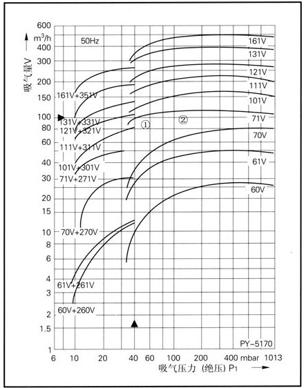 注:该性能曲线是在吸入介质为20℃的饱和空气,工作液温度过15℃,排气压力1013mba的状态下得到的。性能允许差±10%。图中左侧为配用大气喷射器的性能曲线。