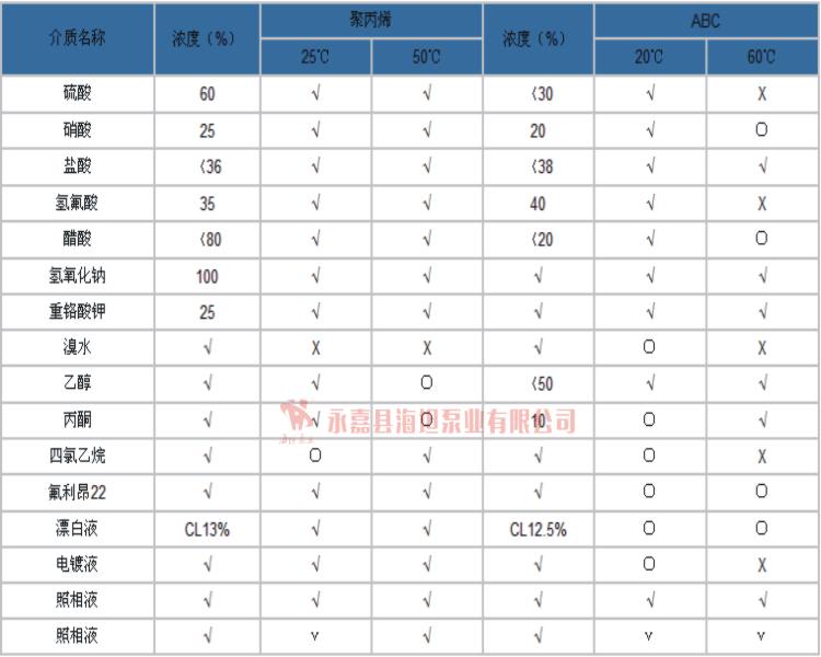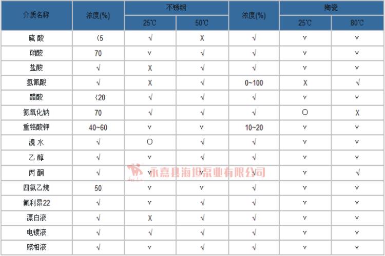 【CQB型不锈钢磁力离心泵】主要材料的耐腐蚀性能(供参考):