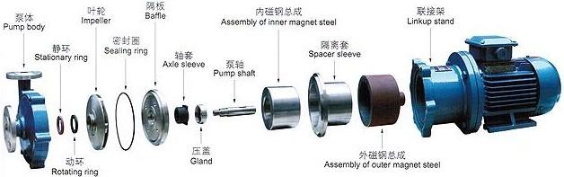 注:泵体材质:304不锈钢;动环材质:填充四氟;静环材质:陶瓷;叶轮:304不锈钢;密封圈:橡胶;隔板:304不锈钢;轴套:填充四氟;压盖:304不锈钢;泵轴:304不锈钢;内磁钢总成:304不锈钢+磁铁;隔离套:304不锈钢;外磁钢总成:铸钢+磁铁
