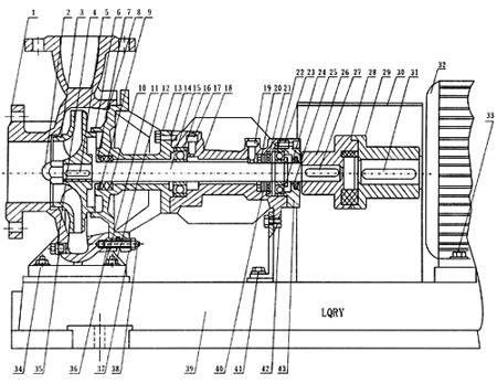 LQRY型热油泵(导热油泵)是本单位消化吸收国外油泵的基础上研制的第二代产品,基本结构形式为单级单吸悬臂式脚支撑结构,泵的进口为轴向吸入,出口为中心垂直向上,和电机同装于底座上。