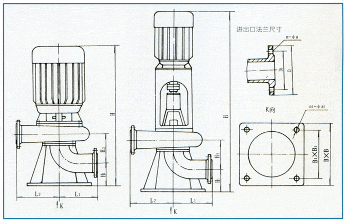 该系列泵具有两种结构形式,一是电机与泵直接同轴,二是采用联轴器联接,电机采用标准立式电机。其结构图如下,每种结构形式具有两种底座连接形式,一是进口水平吸入,具有转角功能,可根据使用要求,进出口安放成0°、90°、180°、270°,便于管路连接,二是进口轴向吸入,便于立式安装。