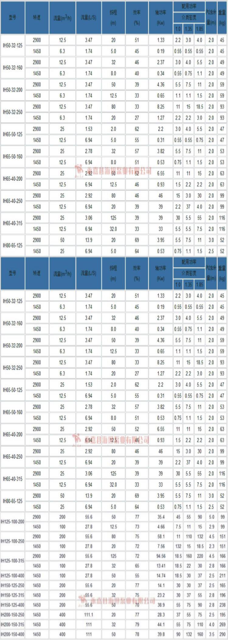 IH型化工泵有29个基本型,其中22个双速(2900、1450r/min)经过A、B两种型式的叶轮直径切割变型后,达112个规格。