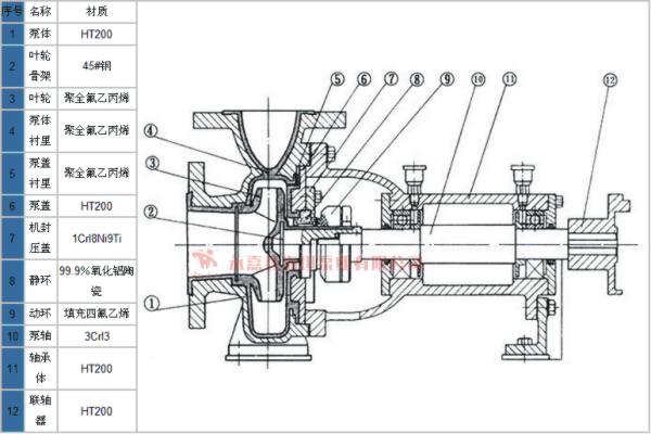 IHF型衬氟塑料离心泵的泵体采用金属外壳内衬聚全氟乙丙烯(F46)、叶轮和泵盖均采用金属嵌件外包氟塑料整体烧结压制成型,轴封采用外装式波纹管机械密封,静环选用99.9%氧化铝陶瓷或碳化硅,动环采用四氟填充材料或碳化硅。其特点是该泵结构先进合理,耐腐蚀强,密封性能严密可靠,工作稳定,噪声低,使用寿命长。