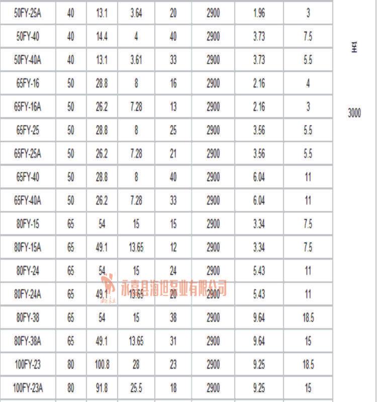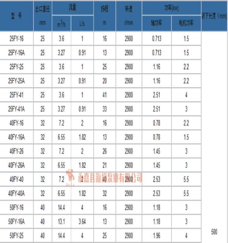 【FY系列不锈钢液下泵】性能参数: