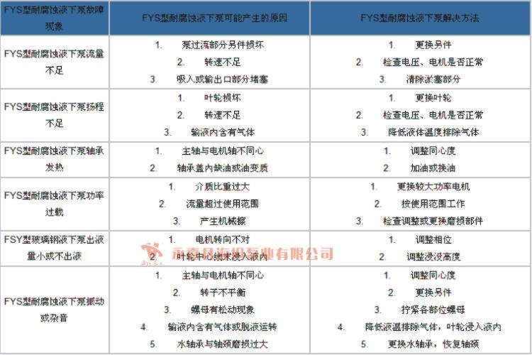 【FYS型耐腐蚀液下泵】故障原因及排除方法: