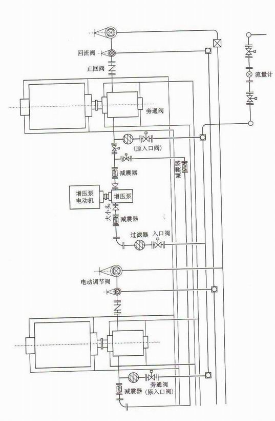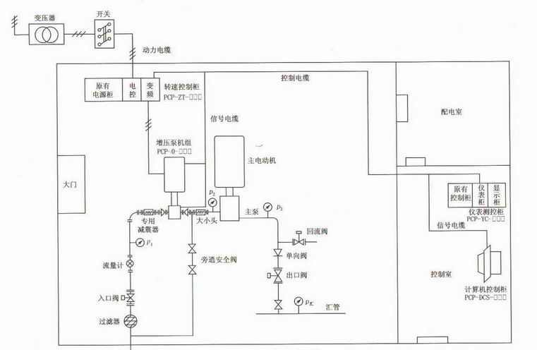 如果是对旧泵站进行PCP改造,可以保留原注水泵入口阀门及管线,在注水泵入口处上接入增压泵调控系统,见图6-26,该图是典型的平面布置图。
