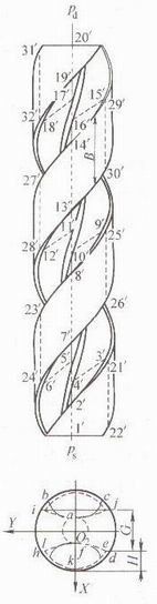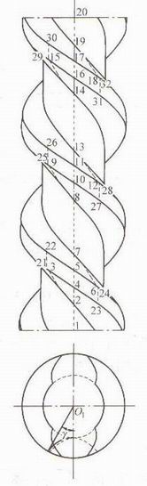 类密封性是指共轭的螺杆螺旋型面的啮合线在螺杆螺旋横截面上的投影啮合线连续,在理论上啮合线能将相邻的螺旋槽有效地隔开。这是排出腔和吸入腔完全隔开的必要条件。类密封性也就是在本章第二节中提到的对螺杆螺旋齿形曲线的要求。不锈钢三螺杆泵理论螺旋型面的啮合线形状如图3-3所示。采用摆线齿形曲线就是为了得到圆弧形的啮合线。这在本章第二节已论证过,在理论上是安全符合类密封性的要求。从图3-13绘制的螺杆螺旋啮合的密封线可以看出:互相啮合的螺杆螺旋接触线能将螺旋槽隔成互不相同的两部分。从动螺杆的螺旋棱边6-7和8-9;和主动螺杆螺旋型面上的6-7和8-9相接触,从动螺杆螺旋型面齿顶圆表面的接触线7-8和主动螺杆螺旋型面齿根圆表面7-8相接触,这样就使主动螺杆的螺旋槽以接触线5-6-7-8-9和从动螺杆上的6-7-8-9-10分隔成互不相通的两部分空间。这些接触线即为螺杆螺旋啮合的密封线,它们在螺杆螺旋面上都是连续的,而且每隔半个导程(即一个螺距)重复出现。因此,在理论上螺杆螺旋互相啮合时,这些密封线能将螺旋槽分割成互不相通,即互相密封的两部分。摆线齿型啮合的密封线在横截面上的投影为圆弧形,故完全符合类密封性的要求。