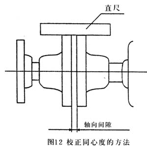 电动机固定在泵座上以后,应校正电动机轴与泵轴的同心度,当用直尺平行放在联轴器圆周上时,要求在整个圆周的任何位置都与联轴器圆周密合没有间隙,当联轴器间的轴向间隙都相等的时候,则达到了所要求的同心度(参见图12)。