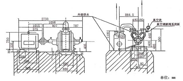 抽气设备与压气设备的区别仅在于气水分离器的构造有所不同,在种情况下,气水分离器中的压力等于大气压,在第二种情况下则等于排气压力,故多余的水通过浮子调整器从气水分离内放走。