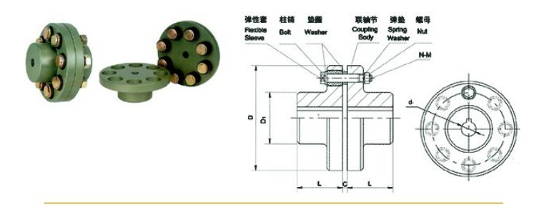 单性套柱销联轴器的特点,结构简单,安装方便,更换容易,尺寸小,重量轻,转动扭矩大,广泛应用与各种旋转泵中。