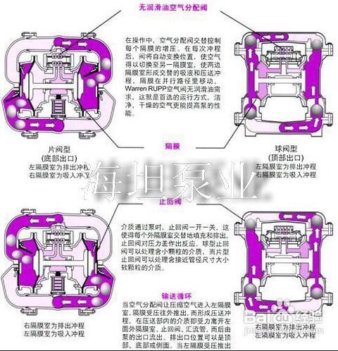 气动隔膜泵是靠气压工作的机械。它将气源从泵进气口输入后通过导向阀和气阀总成交替改变气流方向来交替推动左右隔膜使之吸料和出料,同时阀球随料的进出而打开和关闭来配合一个工作循环的完成。只要泵内部件该密闭的密闭,该畅通的畅通,泵就能循环往复不停工作。在泵正常工作下,根据帕斯卡原理可知,泵频率的快慢,力的大小在受力面积隔膜一定的情况下取决于气源压强的大小。
