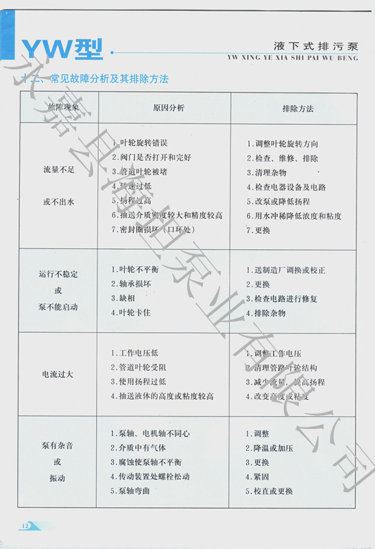 液下深度500mm-350mm双管液下泵性能参数及故障排除法: