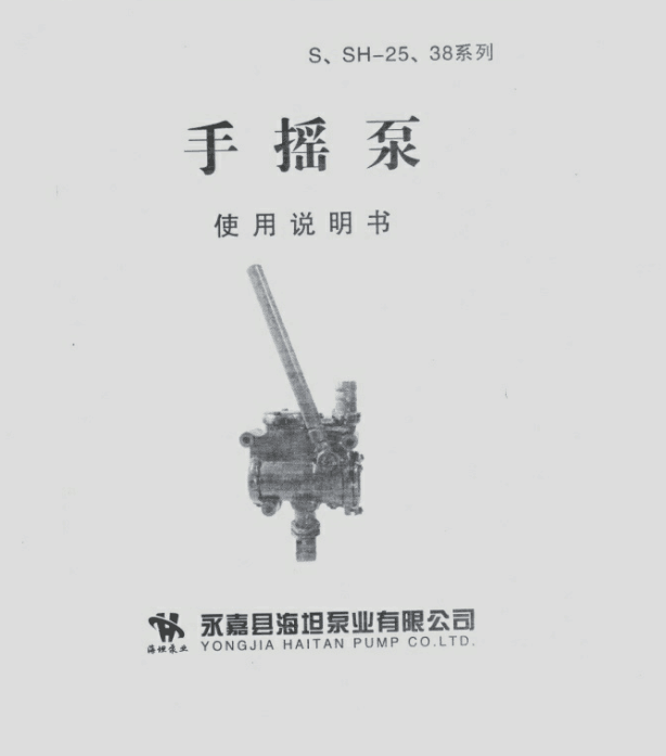 S、SH-25、38型手摇泵的结构原理是,当用手往复摇动摇手柄(29)时,通过轴(21)、摇臂(9)、连杆(36)等传动机构,使活塞(7)作往复运动。如图所示,当活塞向左移动时,右端的泵缸体积逐渐扩大,形成真空,液体从吸水管(34)经过铸在泵体旁边的吸入流道顶开吸水阀进入缸体右端。在同一时间里,缸体左侧由于活塞的压缩,使压水阀(5)顶开,液体经吐出管(11)排出。若活塞的运动方向返回向右时,则泵缸左侧吸入液体,泵缸右侧排出液体,这样往复不歇地把液体吸入排出。形成泵的工作。泵的压水阀向上行程由盖板(6)限止,吸水阀向上行程由压水阀限止。盖板与泵体用螺栓(8)紧固,活塞行程由泵盖(14)和泵体限止。